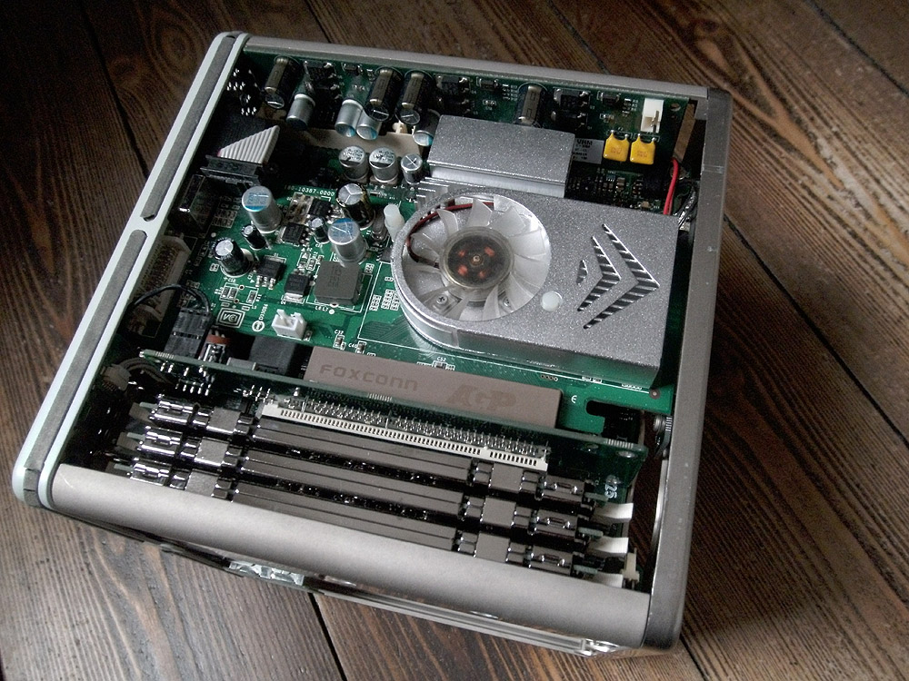 Ansonsten macht es vielleicht noch Sinn, bevor man anfängt, aufzuzählen, was geht, kurz auf das einzugehen, was nicht geht. Das also, was, zumindest dann, wenn man Mods außen vor lässt, die das Gehäuse lediglich als Hülle für einen komplett anderen Rechner missbrauchen, die begrenzenden Faktoren sind. Während der maximale Arbeitsspeicher von 1,5 Gigabyte und die maximale Grafik von 256 Mb mit resultierend maximaler Auflösung von Full HD auch heute noch ganz gut verkraftbar sind, ist der letztlich nicht mehr zu umschiffende Flaschenhals der Systembustakt von aus heutiger Sicht lächerlichen 100 Mhz. Hier findet man die Ursache dafür, dass etwa ein Cube mit einem 1600er Prozessor-Upgrade und ein 1800er Single G5, trotz lediglich 200 Mhz CPU-Takt-Unterschied, in der Real-Life-Perfotmance eben doch gefühlte Welten auseinander liegen. So laufen Full HD Videos auf dem G5 (auch mit der gleichen Grafikkarte) problemlos. Auf dem Cube sind sie beinahe Dia-Show. Am Bustakt aber lässt sich leider pratisch nichts ändern. Zwar kommt man auch hier mit einigen Verrenkungen auf 133 Mhz. Möglichen erheblichen Problemen steht danach aber auf der Haben-Seite, außer der „statusträchtigen“ Anzeige im Systemprofiler, effektiv nichts gegenüber. Spürbare Verbesserungen wären hier wohl erst ab mindestens mal einem Drittel des Prozessortaktes, also irgendetwas um die 400 bis 500 Mhz, zu verzeichnen. Selbst der „kleine“ G5 ist ja mit 900 Mhz unterwegs! Der Cube aber muss hier mit dem auskommen, was er von Haus aus hat. Daran lässt sich leider nichts entscheidendes ändern.