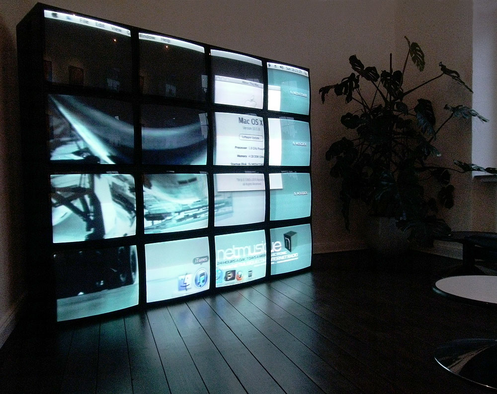 ...eine Wand aus 16 Seleco SMV280 28 Zoll Röhren-Monitoren in Stapelgehäusen. 1,90 Meter hoch, 2,40 Meter breit und knapp 650 Kilo schwer. Bei 1024 x 768 kommt ein Pixel dann auf rund zweieinhalb Millimeter Kantenlänge.