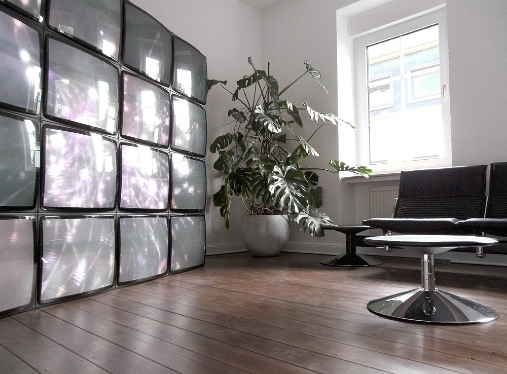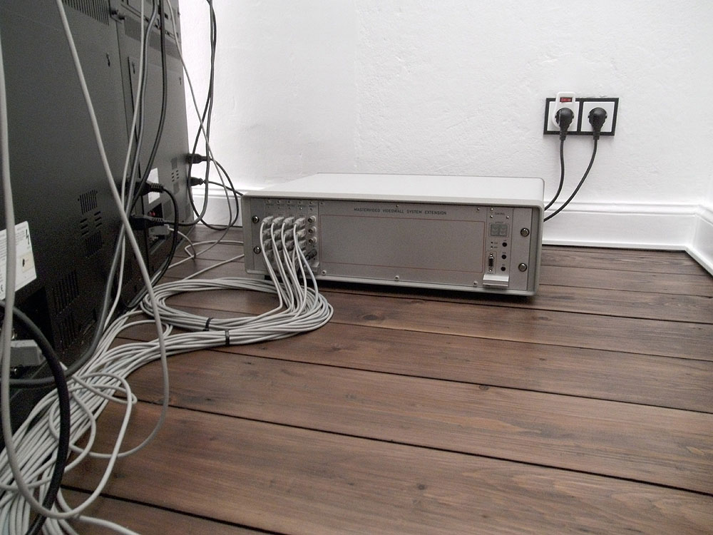 Wenn man genau hinschaut, kann man an der Unterkante der Fußleiste einen Kabelkanal erkennen, in dem 15 Meter S-Video-Kabel, aus dem Büro kommend, das Zimmer umkreisen, um in dem Rechner zu enden, der die ganze Pracht ansteuert.