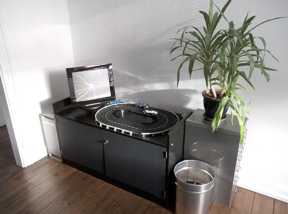 Wem beim „Arbeiten“ am unerträglich langsamen G5 langweilig wird, der kann ein paar Runden auf der Carrera-Bahn drehen.