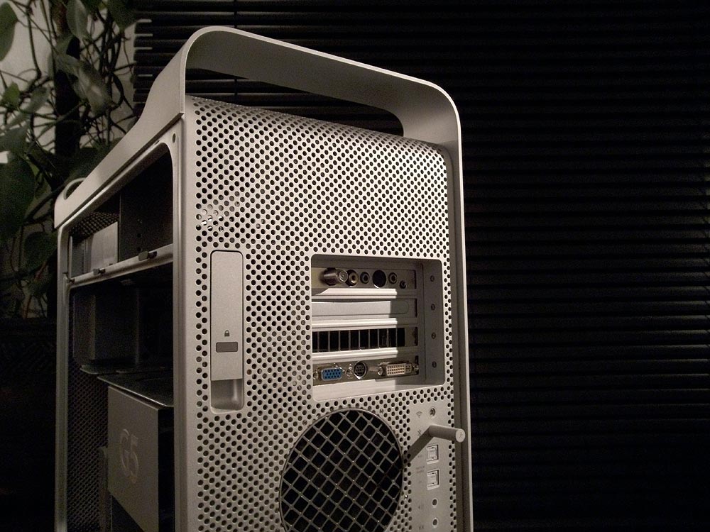 Herzstück ist mein ehemaliger Arbeitsplatz-Rechner, ein 2003 (als bisher einziger Rechner) neu gekaufter 1,8 Single Prozessor G5. Noch der Gute mit 900 Mhz Bustakt. Quasi das einzige Mal in meinem langen Mac-User-Leben, das ich einigermaßen „up-to-date“ war und auf MU ganz kurz hätte „mitreden“ können.