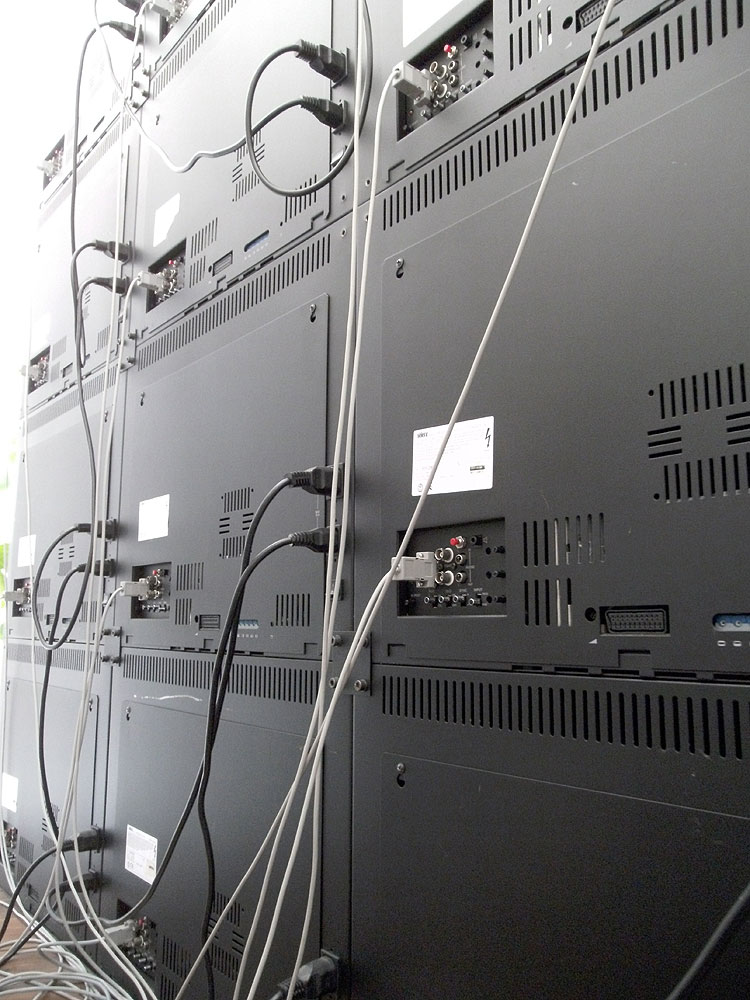 Ein Kaltgerätekabel durchläuft alle 16 Glotzen mit wohl extra hierzu angefertigten etwa Halbmeter langen Durchschleif-Verlängerungen. Ansonsten die RGB-Kabel von der Box. Das war’s.