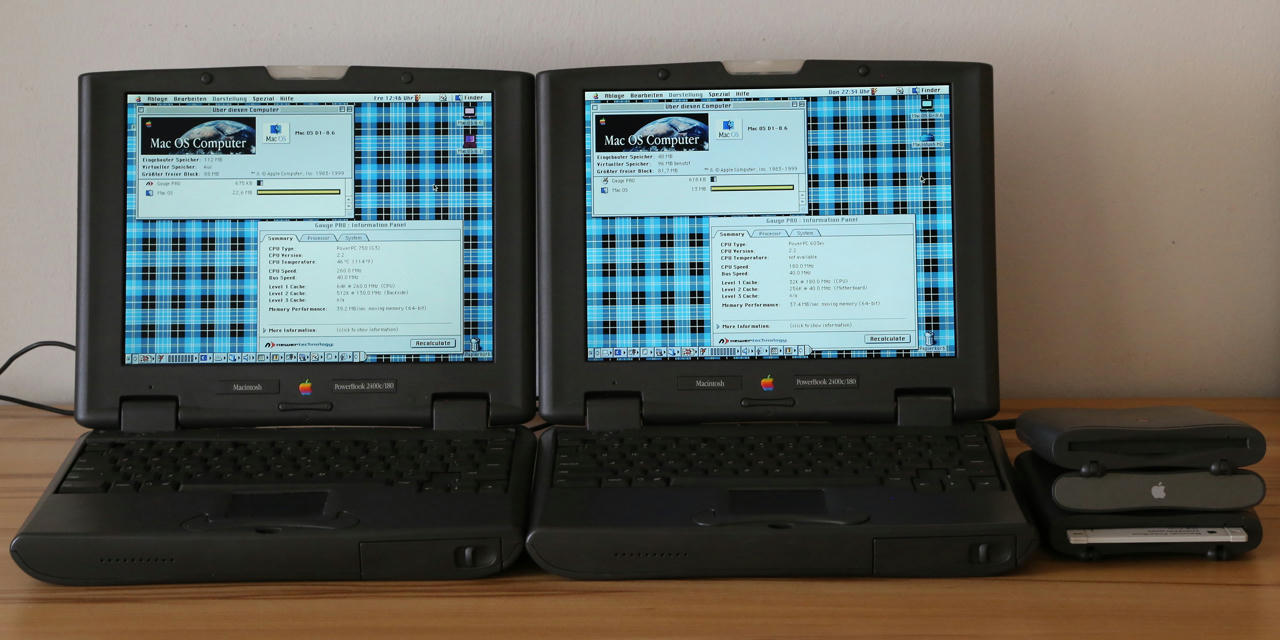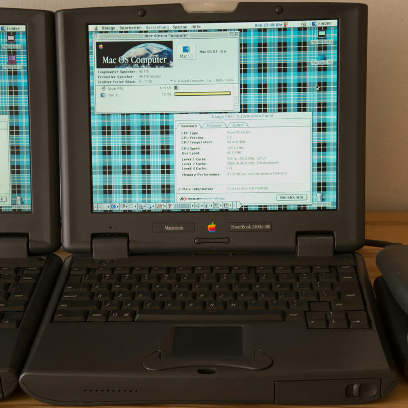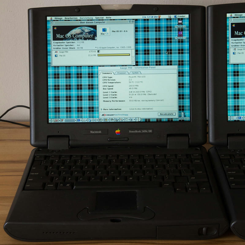 Bei mir sind 2 (in Worten: ZWEI) PowerBooks 2400c eingetroffen, eines davon mit einem Newer Technology NUpowr G3 2400/240MHz Prozessor, eingestellt auf 260MHz und 112MB max. RAM, das andere mit einem 180MHz PPC und 48MB RAM.