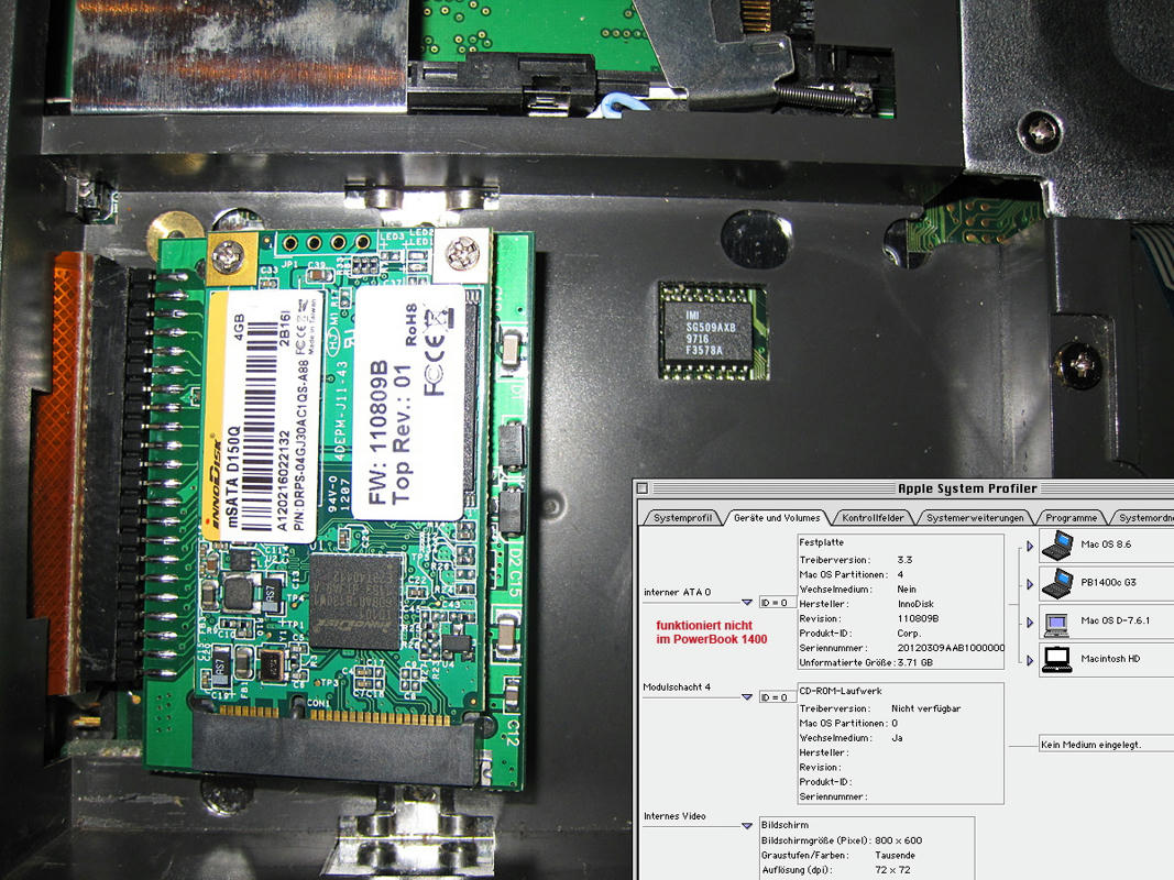 Also habe ich die mSATAs nacheinander ins PowerBook 1400c (mit G3/250MHz Prozessor-Karte und max RAM) eingesetzt und getestet.